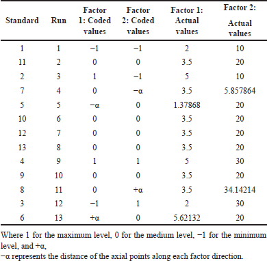 ![]() | Table 2. Design of experiment for CCD method with 13 trial runs with results of responses. [Click here to view] |