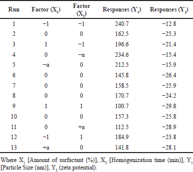 ![]() | Table 1. Different sets of experiments for 13 trials of formulations with coded and actual values. [Click here to view] |