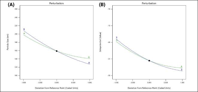 ![]() | Figure 1. Perturbation plots showing the individual effect of independent variables on the responses: (A) The influence of Tween 80 concentration (X1) and homogenization time (X2) on particle size (Y1). The curves illustrate that both variables exhibit moderate curvature, indicating their significant but non-linear influence on the particle size. (B) The influence of Tween 80 concentration (X1) and homogenization time (X2) on zeta potential (Y2). Both factors exhibit a consistent negative slope, indicating an increase in the negative charge (zeta potential) with increasing levels of the variables. [Click here to view] |
