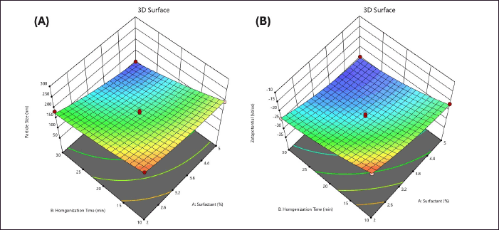![]() | Figure 2. 3D response surface plots showing the interaction effect of independent variables on the responses: (A) Interaction effect of Tween 80 concentration (X1) and homogenization time (X2) on particle size (Y1). Lower particle size was observed at higher Tween 80 levels and intermediate homogenization time. (B) Interaction effect of Tween 80 concentration (X1) and homogenization time (X2) on zeta potential (Y2). A more negative zeta potential was observed with increasing homogenization time and surfactant concentration, indicating enhanced stability of the formulation. [Click here to view] |