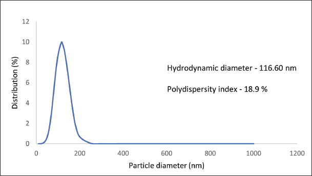 The obtained results revealed a particle size of 116.60 nm (Fig. 3), indicating the mean diameter of the particles within the sample. Additionally, the PDI was measured at 18.9%, reflecting the distribution of particle sizes within the sample.