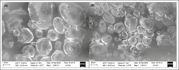 ![]() | Figure 4. SEM images of the optimized BO nanoemulsion formulation: (A) image captured at a magnification of 10,000× with a scale bar of 1 µm, showing the uniform and spherical morphology of nanoemulsion droplets with minimal aggregation. (B) Image captured at a magnification of 20,000× with a scale bar of 2 µm, providing a closer view of the surface topography and particle integrity of the nanoemulsion droplets, highlighting the smooth texture and consistent size distribution. [Click here to view] |