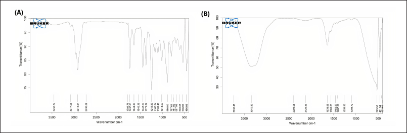 ![]() | Figure 5. ATR-FTIR reports of (A) BO and (B) optimized formulation of Bergamot nanoemulgel. [Click here to view] |