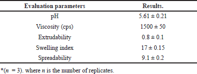 The assessment of gel characteristics was conducted and presented in Table 3, which outlines the results for pH, viscosity (measured in centipoise, cps), extrudability, swelling index, and spreadability. This meticulous characterization is crucial for gauging the suitability and performance of the gels for intended applications, ranging from pharmaceuticals to cosmetics.