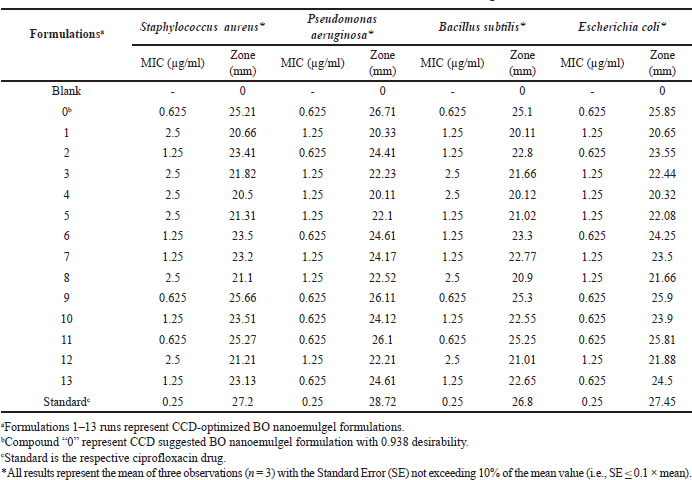 The antimicrobial activity of the optimized BO nanoemulsion formulations was assessed using the agar well diffusion method on Mueller−Hinton agar, with all tests performed in triplicate [31]. To evaluate broad-spectrum antibacterial efficacy, four clinically relevant bacterial strains commonly associated with skin and wound infections were selected: S. aureus (MTCC 737) and B. subtilis (MTCC 441) representing Gram-positive bacteria and P. aeruginosa (MTCC 1035) and E. coli (MTCC 443) representing Gram-negative bacteria. These organisms were cultured in nutrient broth for 24 hours to achieve a turbidity of approximately 109 CFU/ml [31–33]. Each culture was then mixed with molten soft agar (maintained at 45°C–50°C), poured evenly over the surface of base agar plates, and allowed to solidify under laminar airflow. Wells of 6 mm diameter were created aseptically in the agar plates, and 0.15 ml of test formulations, dissolved in Dimethyl Sulfoxide (DMSO) at concentrations ranging from 0.020 to 10 mg/ml, were added into the wells. Ciprofloxacin was used as the positive control, while DMSO served as the negative control. Additionally, a blank nanoemulgel formulation containing all the excipients (Tween 80, Carbopol 934, and distilled water), but excluding BO was prepared and tested under identical conditions to determine any inherent antibacterial effects of the base formulation. Plates were allowed to stand for 15 minutes at room temperature before being incubated at 37°C for 24 hours. After incubation, the diameters of the zones of inhibition were measured using a digital antibiotic zone reader (Optics Technology, India) to quantify antibacterial activity.