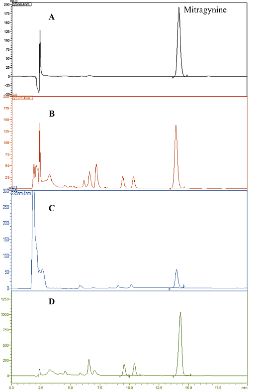 ![]() | Figure 1. HPLC chromatogram: (A) Mitragynine (MG); (B) Methanol extract (KM); (C) Aqueous extract (KW); (D) Alkaloid extract (KA). [Click here to view] |