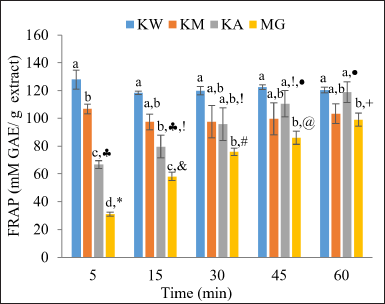 ![]() | Figure 2. FRAP assay results for KW, KM, KA, and MG at various time points from 5 to 60 minutes of incubation. Data are presented as mean ± SD (n = 3). Different symbols represent statistically significant differences between time points within the same sample group, and different alphabetic letters represent statistically significant differences between sample groups at the same time point (p < 0.05). KW = Aqueous extract; KM = Methanol extract; KA = Alkaloid extract; MG = Mitragynine. [Click here to view] |