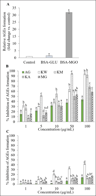 ![]() | Figure 3. Antiglycation assay: (A) Formation of AGEs after 2 weeks of incubation in the BSA-glucose and BSA-MGO assays. (B-C) Antiglycation activity of AG, KW, KM, KA, and MG at 1, 5, 10, 50, and 100 µg/ml in the BSA-glucose (B) and BSA-MGO (C) assays. Data are expressed as % inhibition relative to control and are presented as mean ± SD (n = 3). * indicates significant differences compared to the control group (p < 0.05) as determined by the independent samples t-test. Different alphabetic letters represent statistically significant differences between sample groups at the same concentration (p < 0.05). AG = Aminoguanidine; KW = Aqueous extract; KM = Methanol extract; KA = Alkaloid extract; MG = Mitragynine. [Click here to view] |