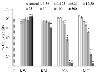 ![]() | Figure 4. HepG2 cell viability after 24-hour exposure to KW (6.25–500 µg/ml), KM (6.25–100 µg/ml), KA (1.56–100 µg/ml) and MG (1.56–100 µg/ml). Data are expressed as % cell viability relative to the untreated control and shown as mean ± SEM (n = 3). * indicates significant differences compared to the control group (p < 0.05). C = Control; KW = Aqueous extract; KM = Methanol extract; KA = Alkaloid extract; MG = Mitragynine. [Click here to view] |