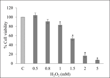 ![]() | Figure 5. HepG 2 cell viability after exposure to H2O2 (0.5–5 mM). Data are expressed as % cell viability relative to the untreated control and presented as mean ± SEM (n = 3). * indicates significant differences compared to the control group (p < 0.05) as determined by the independent samples t-test. C = Control; KW = Aqueous extract; KM = Methanol extract; KA = Alkaloid extract; MG = Mitragynine. [Click here to view] |
