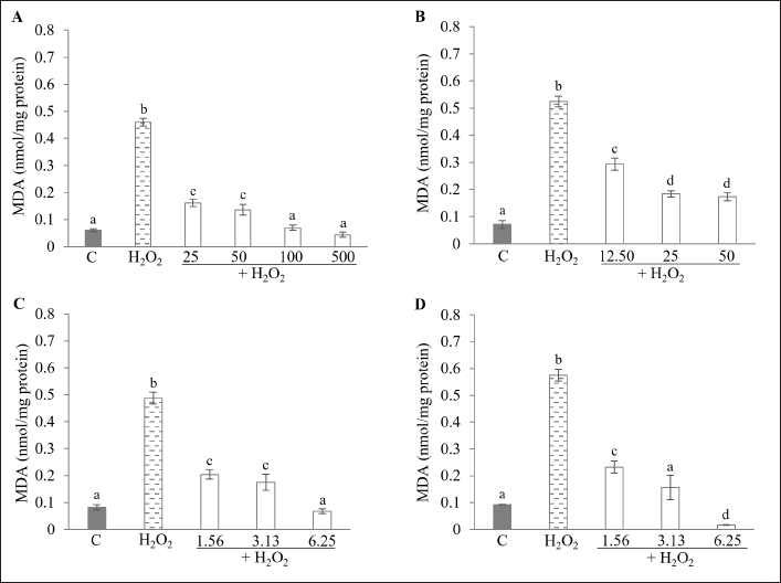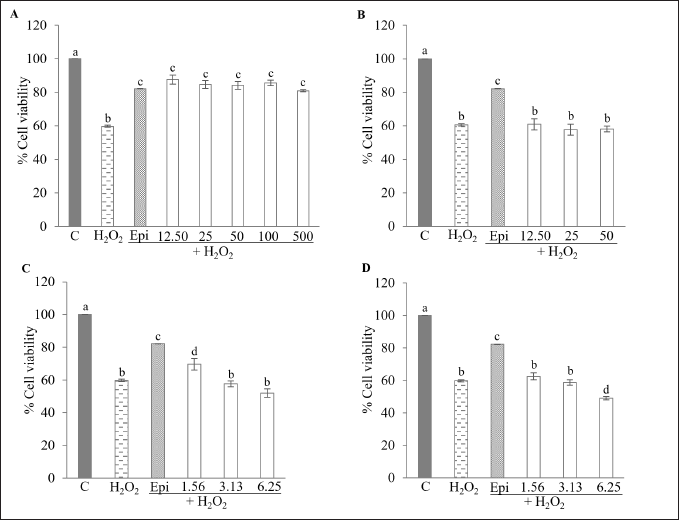 Cytoprotective effect of kratom extracts and MG were assessed against H2O2-induced toxicity in HepG2 cells using an MTT assay [25]. Initially, HepG2 cells were incubated for 24 hours in the presence of H2O2 (0.5–5 mM) to determine the appropriate cytotoxic concentration of H2O2. Once the optimal concentration of H2O2 was obtained, the cells were pre-treated for 24 hours with non-cytotoxic concentrations of kratom extracts and MG and thereafter treated with H2O2 (1.5 mM) for an additional 6 hours. Each experiment was performed in triplicate using epicatechin (100 µM) as a positive control.