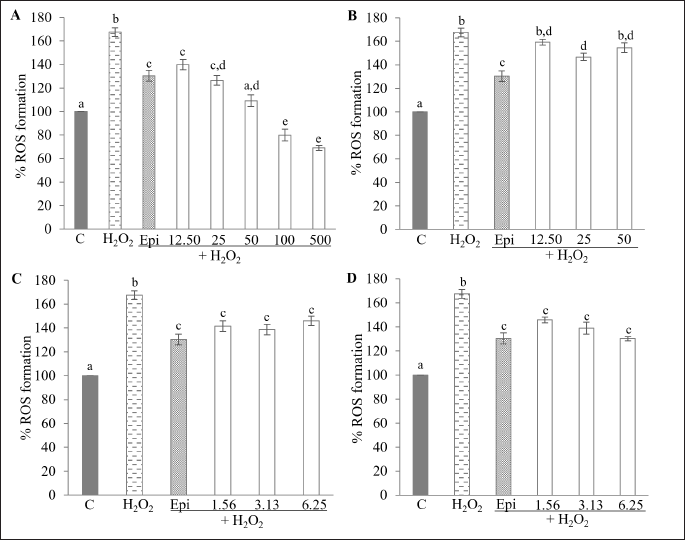 Intracellular ROS levels were measured using the DCFH-DA assay [25]. HepG2 cells were seeded into 48-well plates at a density of 2.5 × 104 cells/well. Following a 24-hour exposure to non-cytotoxic concentrations of kratom extracts and MG, the cells were rinsed with 10 mM PBS (pH 7.4) and then incubated with 10 µM DCFH-DA for 30 minutes at 37°C in the dark. After that, the cells were washed with ice-cold PBS and subsequently treated with 1.5 mM H2O2 in a serum-free medium for 1 hour. The cells were then washed, lysed, and centrifuged at 13000 ×g for 10 minutes at 4°C. Fluorescence intensity in the supernatant was measured at 485 nm for excitation and 530 nm for emission wavelengths. The results were normalized to protein concentration, as estimated by the Bradford assay (Bio-Rad, California, USA), and reported as a percentage of ROS formation relative to untreated cells. Each experiment was conducted in triplicate, with 100 µM epicatechin serving as a positive control.