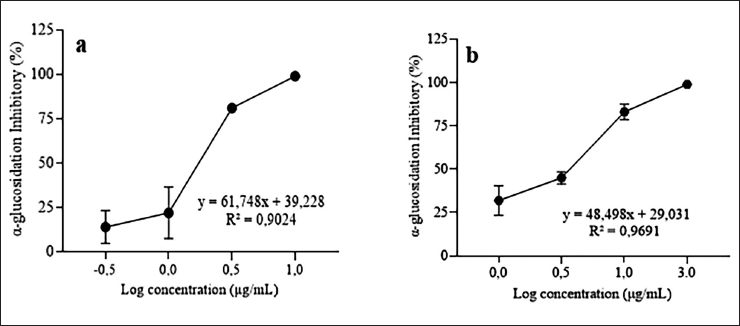 Figure 1. Profile of concentration inhibition of α-glucosidase activity. Phyllanthus niruri extract (a) and corosolic acid (b). The IC50 values for the P. niruri extract and corosolic acid on α-glucosidase inhibition are 1.48 ± 0.51 and 2.72 ± 0.72 µg/ml, respectively.