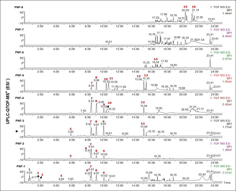 Figure 2. The MS chromatograms of the Phyllanthus niruri fractions in negative mode.