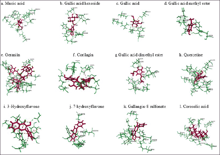 The simulation of molecular docking was performed using Molegro Virtual Docker (MVD) ver. 6.0 to estimate the inhibitory action mechanism of P. niruri bioactive compounds against α-glucosidase. For the 3D structure of α-glucosidase from the Saccharomyces model, homology modelling was constructed using the Swiss model (swissmodel.expasy.org) as the structure is not available in the Protein Data Bank (www.rscb.org). The α-glucosidase structure used in the assay is an enzyme with a sigma product number G0660 and commission number 3.2.1.20. Based on this information, the appropriate sequence was selected in the UniProt P53341-MAAL12-yeast, which consists of 584 amino acids. The model was built by copying and pasting the fasta of the sequence using the Swiss model (swissmodel.com) with the 3AXH.1A as a template, which has a sequence identity of 72.12% and a GMQE of 0.94. The 3D crystal structure of α-glucosidase model was used as a receptor in the docking study then it was imported to the MVD program. As an initial approach, validation of docking protocol settings was done through isomaltase (ligand reference of 3AXH.1A) at some cavities of the enzyme structure. We are confirming the confidence in our study used the docking protocol reproduces the bound structure closely with root mean square deviation (RMSD) values less than 2Å [24]. Then, active compounds of P. niruri herb were selected to be docked into the receptor at the position, and the interactions were investigated.