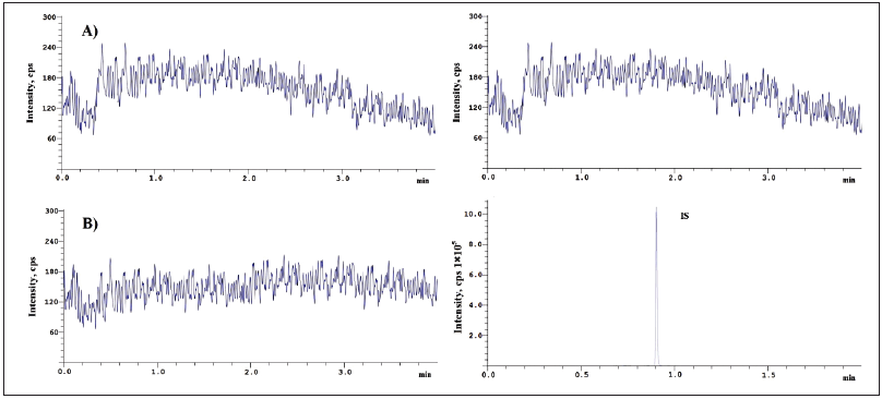 The evaluation of selectivity was conducted using the K2EDTA plasma without any substances present. The assessment of selectivity should indicate that there were no notable interferences detected for IS and Tucatinib retention times in blank plasma [11].
