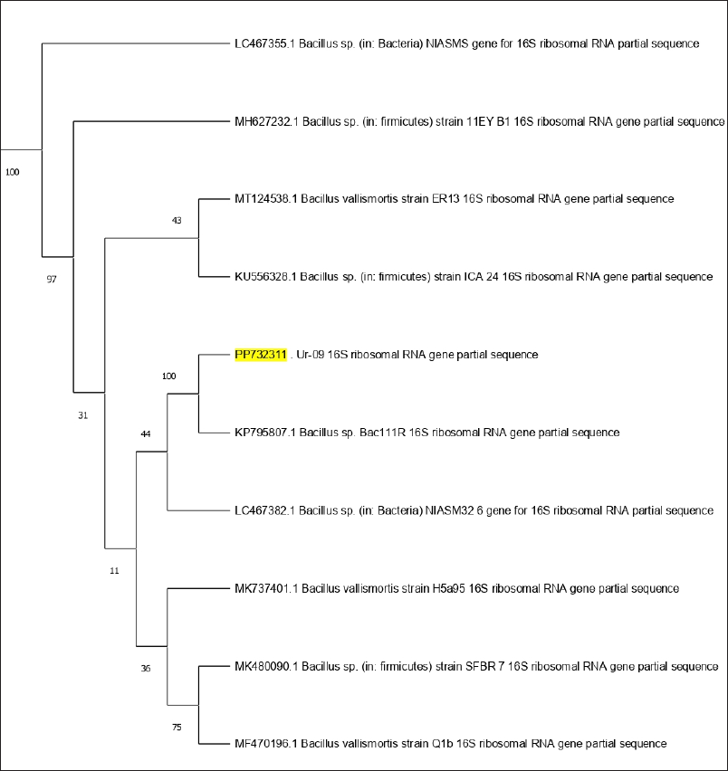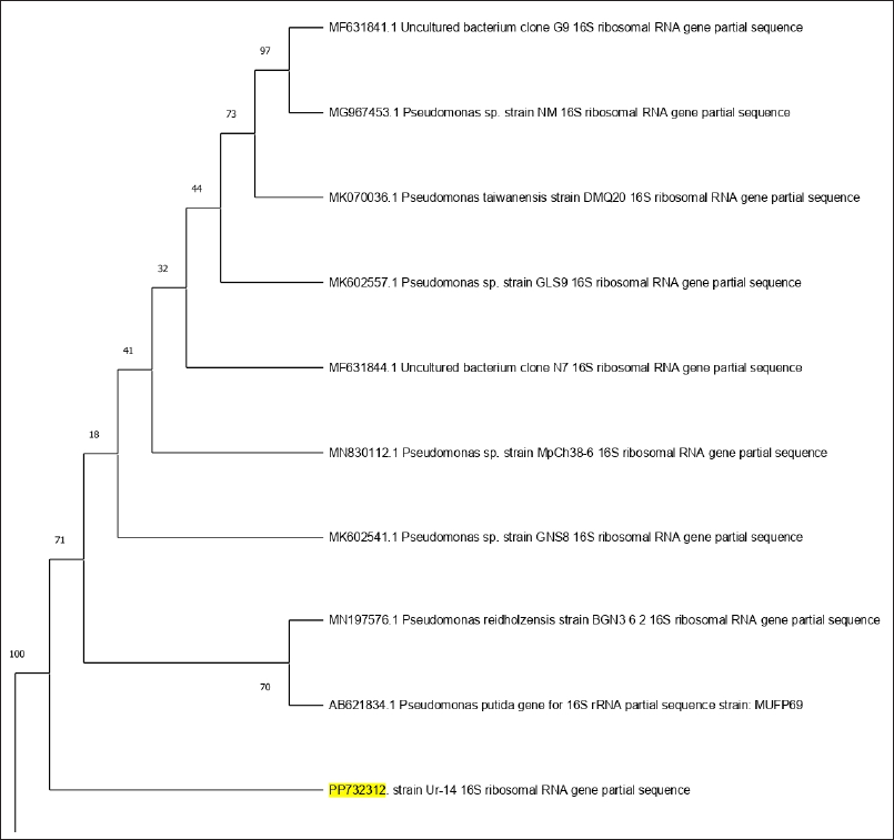 ![]() | Figure 3. Phylogenetic tree of bacterial evolutionary relationships inferred from aligned 16S rDNA sequences of coded bacterial isolate strain Ur-33. PP732310. [Click here to view] |