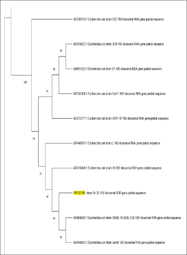 The investigation of the 16S rRNA sequences of the bacterial isolate Ur-33, which contains 1,895 bp. It has been submitted to the NCBI BLAST engine for processing. A phylogenetic tree with similar sequences was subsequently generated using the neighbor-joining approach for an isolated bacterial strain (Fig. 3). From the BLAST search, the homologous sequences were used to create a phylogenetic tree, revealing that Ur-33 is 100% related to E. coli strain (with an accession number PP732310).