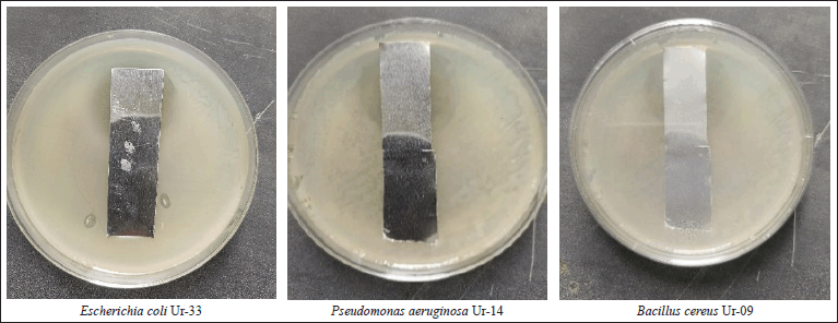 The urine samples were collected and subjected to the isolation of bacterial pathogens. After incubation, the colonies’ purity is checked by colonial morphology and Gram stain, then subjected to biochemical and molecular tests for identification. Three bacterial isolates, including E. coli (Ur-33), P. aeruginosa (Ur-14), and Bacillus cereus (Ur-09) confirmed identification corresponding to 16S rRNA gene sequencing, and the results are as follows.