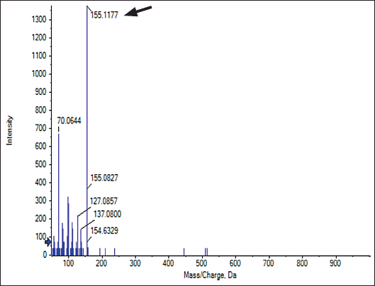 The major crude compound was identified by the Liquid Chromatography-Tandem Mass Spectrometry (LC-MS/MS) tools. Positive mode LC-MS analysis of crude extract showed that 3,4-dihydroxybenzoic acid (Figs. 6 and 7) was the major compound. Liquid chromatography-MS/MS assessment (positive mode) of the S. geysiriensis EA extract was used to anticipate the chemical formula of a molecular compound in accordance with m/z 155.1177 by using the Peak View software, which recommended the molecular formula of C7H6O4, [M+H+]. Liquid chromatography-MS/MS decided the major metabolite (labeled by arrow), with antibacterial assay defined as 3,4-dihydroxybenzoic acid. Further confirmation for the proposed structure was performed by co-chromatographic analysis of authentic 3,4-dihydroxybenzoic acid with an isolated compound, which reveals that both have the same RF value, which is further evidence for the identity of the proposed structure.