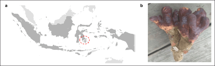 ![]() | Figure 1. Theonella sp. taken from waters around Saponda Island, Konawe Regency, Southeast Sulawesi, Indonesia. (a) Map of Indonesia indicating the location of sponge collection (red dashed circle); (b) photograph of the collected sponge Theonella sp. [Click here to view] |