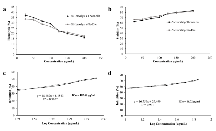![]() | Figure 2. In vitro anti-inflammatory activity tests of the ethanol extract of Theonella sp. (a) Hemolysis activity of the ethanol extract of Theonella sp. in HRBC. Diclofenac sodium was used as a positive control; (b) stability activity of the ethanol extract of Theonella sp. in HRBC. Diclofenac sodium was used as a positive control; (c) protein denaturation inhibition of the ethanol extract of Theonella sp.; and (d) protein denaturation inhibition of diclofenac sodium. Data are presented as mean ± SD (n = 3). [Click here to view] |