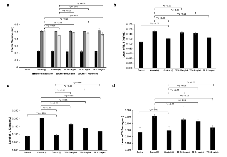 The data obtained were analyzed using the IBM SPSS statistics program. The effects of the TE on the levels of IL-6, IL-12, and TNF-α in all treatment and comparison groups were analyzed using one-way analysis of variance followed by Tukey’s post-hoc test. p < 0.05 indicates a significant difference in activity between the groups. In the figures, the following notation is used:* indicates p > 0.05 (not significant); ** indicates p < 0.05 (statistically significant).