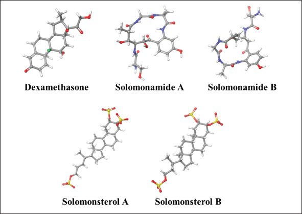 ![]() | Figure 4. The 3D visualization of dexamethasone and compounds from Theonella sp. [Click here to view] |