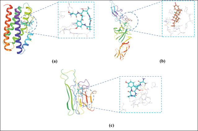 ![]() | Figure 5. Visualization of 3D ligand–receptor complex with binding free energy: (a) IL 6-Solonamide A, (b) IL-12-Solonamide B, and (c) TNF-α-Solomonamide B. Yellow dotted line: hydrogen bond. [Click here to view] |