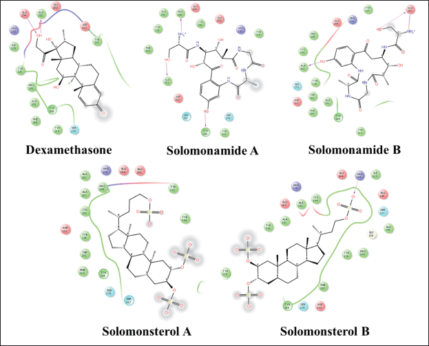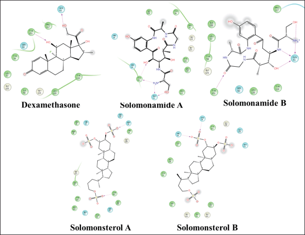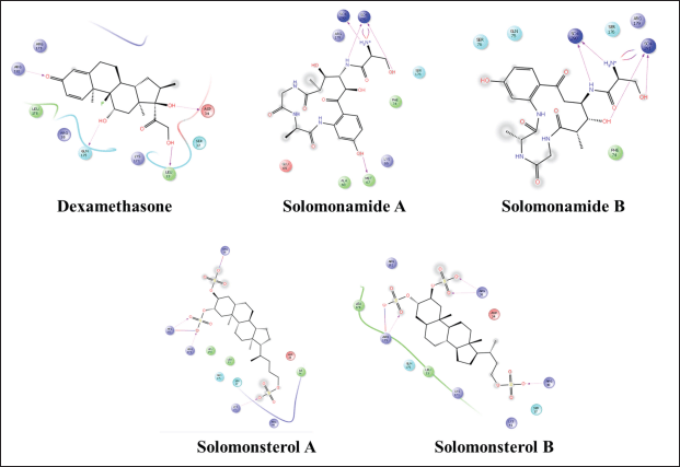 The best compound in terms of binding free energy value is the IL12-solomonamide b complex, forming hydrophobic bonds on the backbone with Ala 202 (bond length: 1.66 ?) and hydrogen bonds on the side chain of Glu 203 (1.77?) with a bond affinity value of –8.3 Kcal/mol. The potential amino acid residues for binding IL 12 are Ala, Glu, Asp, Tyr, and Arg. The TNF α–dexamethasone complex forms a hydrophobic bond in the side chain with tyr 151 (bond length: 2.09 ?), forms a hydrogen bond in the side chain with Gln 61 (bond length: 1.97?), with a bond affinity value of –4.0 Kcal/mol from Theonella sp. This target has a free energy value indicating activity towards this mediator (compounds 1, 2, 3, and 4 respectively –1.7, –1.3, –2.4, and –4.0 Kcal/mol), but the binding free energy value is greater than the comparison compound could indicate that the compound’s binding interaction with the receptor is unstable. The data displayed also involve non-bonding interaction with the target. The 2D visualization of all compounds is in Figures 6–8.