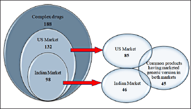 The market landscape of complex generics is dynamic and diverse, with 45 complex generic products launched by various manufacturers across both countries. A comprehensive list of 188 products was compiled from several secondary sources. These 188 products were deemed complex medicines whose generic equivalents are either now on the market or have yet to be released; in addition, those drugs whose research is ongoing to develop complex generic versions (Fig. 1). Of the 188 items, 132 complex drugs were found in the US market and 98 in the Indian market. There are 85 US-marketed products with generic versions available.