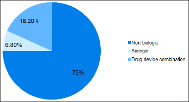 The complex generics were divided into nonbiologic, biologic, and drug-device combination products based on the nature of the molecule. In the market for value-added products, nonbiologics complex generics held the highest market share (Fig. 3). Their extensive acceptance across therapeutic fields can be due to their more straightforward developmental and analytical attributes, flexibility for dealing with different diseases, and established regulatory procedures for approval compared to the other two classes.