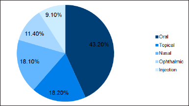 The complex generics market is divided into oral, topical, nasal, ophthalmic, and injectable groups based on the route of administration. The market with the largest share was complex generics that provide treatment through oral administration (Fig. 4). Easy accessibility, patient preference, and convenience of oral formulations for various therapeutic needs may be the leading causes of this hike in market share.